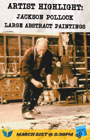 This time we will be focusing on large abstract mark making in the style of Jackson Pollock! Join us to work on your own giant painting after a quick informative presentation on Pollocks work!