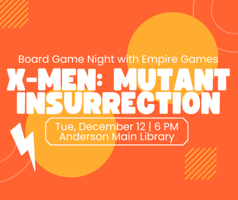 Game board night is appropriate for ages 14 and above. Questions? Contact the Electric City Creative at eccstaff@andersonlibrary.org.