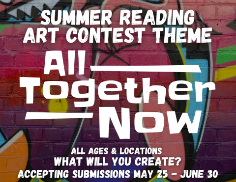 What does our Summer Reading theme “All Together Now” mean to you? Hit us with your sketching, marking, collaging, printing, painting, needlepoint, quilting, sculpting, photography, or whatever makes your creative best! Open to all ages! See below or the entry form for rules and details.
