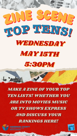 Welcome to the Anderson County Library Zine Scene! Zines are a way of expressing your ideas in an accessible hand made publication!