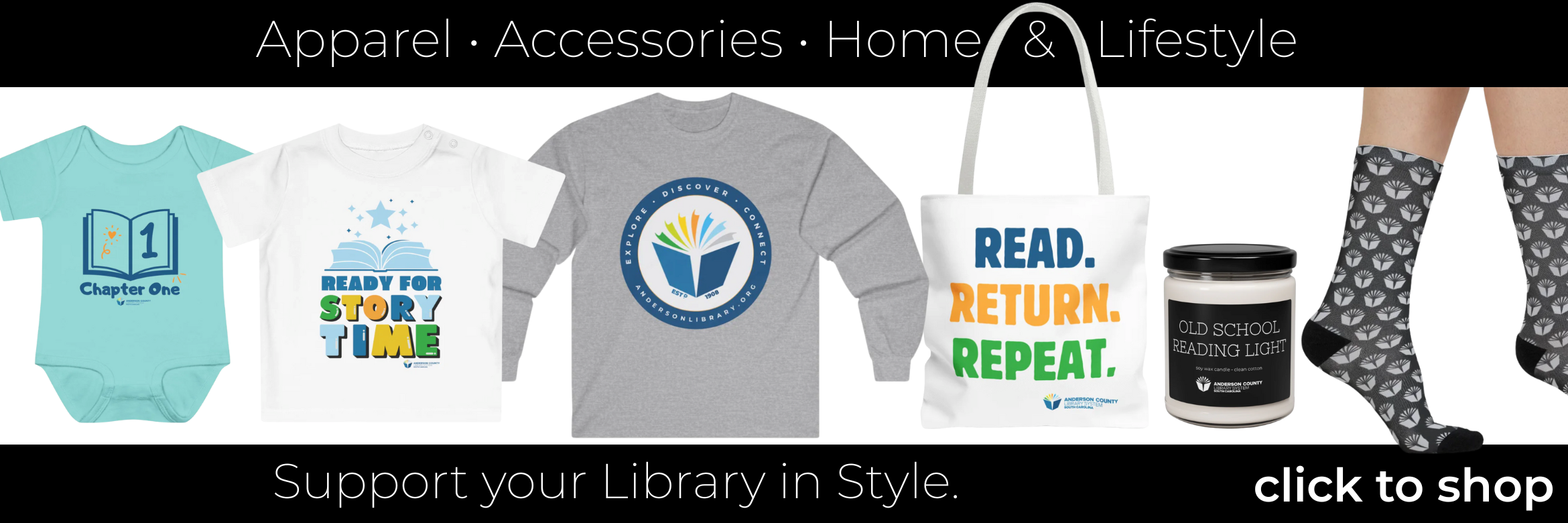 Located at the Main Library, all proceeds from the Bookstore support the Friends of the Anderson County Library. The Book Store offers gently used books, movies, and magazines as well as local postcards, bookmarks, with rotating special sales every month. The gift shop has a variety of items, totes, gifts and Library t-shirts!