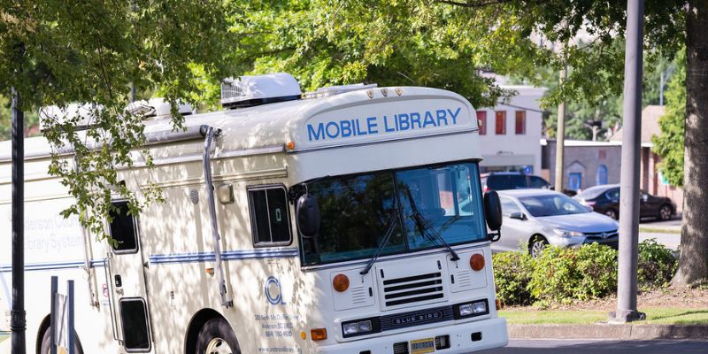 Bookmobile bus vehicle with "Mobile Library" imprint on front