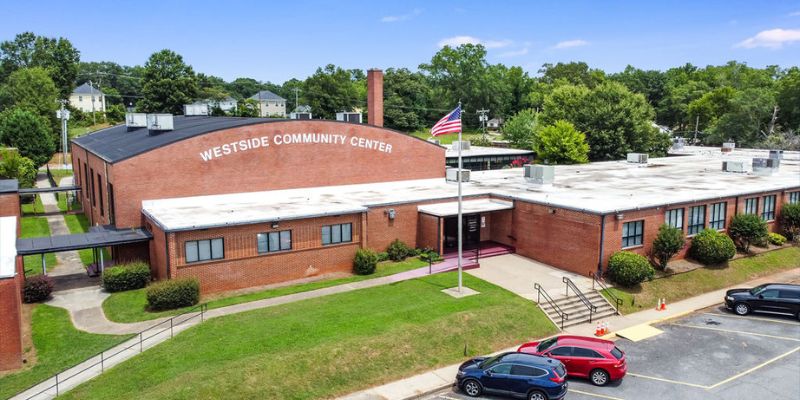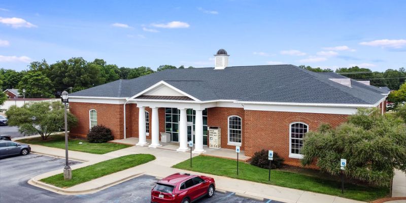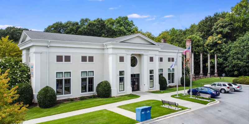 Aerial shot of Powdersville Library building front featuring brick, columns, plinth, and cupola