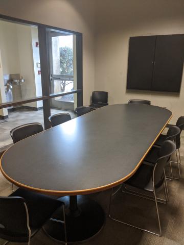 This room has a whiteboard mounted on the wall. A portable LCD projector and DVD player with a TV are available upon request.