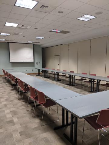 This room can accommodate up to 60 chairs in rows, or 25 to 40 chairs at 10 to 12 tables, depending on arrangement. Tables are 5 feet long.
